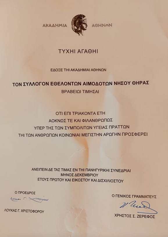 Η Τράπεζα Αίματος Σαντορίνης φέτος γιορτάζει τα 30α γενέθλια της, κάνοντας περήφανους τους κατοίκους και τους εθελοντές αιμοδότες του νησιού. Βραβεύτηκε για το έργο της και από την Ακαδημία Αθηνών, ενώ κατέχει μία από τις πρώτες θέσεις στην ΕΕ σε προσφορά αίματος, ανά 1000 κατοίκους.