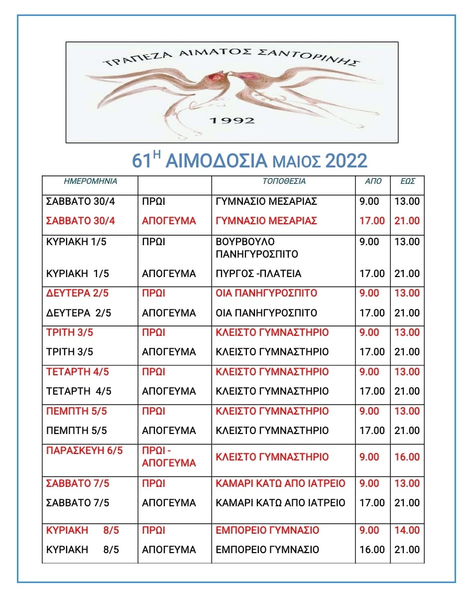 Μην ξεχνάτε ότι η 61η εθελοντική αιμοδοσία ολοκληρώνεται στις 8 Μαϊου και 10 λεπτά από το χρόνο σας μπορεί να σώσει ζωές.