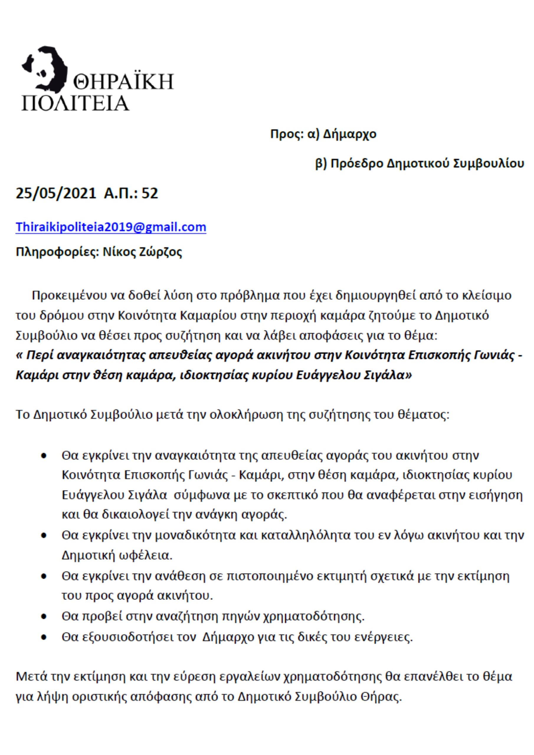 Παρακολουθώντας την εξέλιξη των προβλημάτων το Καμάρι η παράταξη μας απέστειλε αίτημα προς τον Δήμαρχο και τον Πρόεδρο του Δημοτικού Συμβουλίου για τη σύγκλιση Δημοτικού Συμβουλίου με σκοπό την αγορά ακινήτου ιδιοκτησίας κ. Ευαγγέλου Σιγάλα στην περιοχή «Καμάρα».