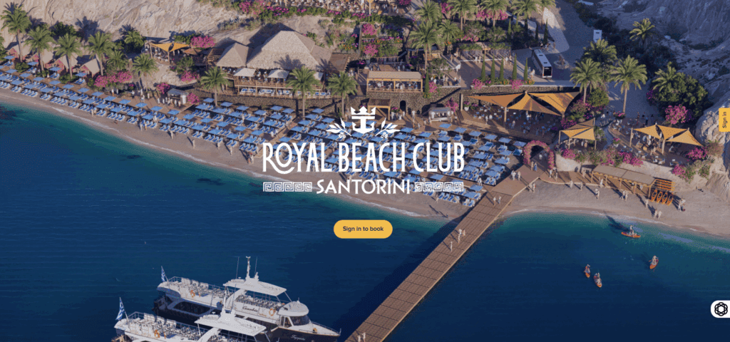 Σύμφωνα με την επίσημη ιστοσελίδα της εταιρείας αναφέρεται ” Σας παρουσιάζουμε το Ultimate Santorini μια ολοήμερη εκδρομή γεμάτη με τα απαραίτητα αξιοθέατα του νησιού, που τώρα περιλαμβάνει το πρώτο Royal Beach Club στην Ευρώπη το οποίο θα ξεκινήσει το καλοκαίρι του 2026. Η περιπέτειά σας ξεκινά με μια γραφική εκδρομή με πλοίο κατά μήκος της εκπληκτικής ακτογραμμής της Σαντορίνης. Απολαύστε τον ήλιο σε μια ηφαιστειακή παραλία με μαύρη άμμο, ενώ απολαμβάνετε γκουρμέ γεύματα και εκπληκτική θέα στον ωκεανό. Κάντε μια στάση στην Οία για να θαυμάσετε την εμβληματική αρχιτεκτονική με τους μπλε τρούλους και στα Φηρά, για να κάνετε μια βόλτα κάτω από τον ήλιο στη ζωντανή πρωτεύουσα. Η απόλυτη μέρα σας στη Σαντορίνη σας περιμένει το καλοκαίρι του 2026″.