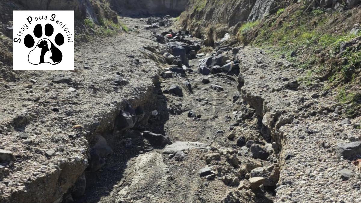 Απαιτούνται πολυήμερες και εξειδικευμένες εργασίες για την αποκατάσταση της πρόσβασης για την προσέγγιση του καταφυγίου αδέσποτων ζώων Stray Paws Santorini μετά τις εκτεταμένες ζημιές που υπέστη ο δρόμος λόγω της πρόσφατης κακοκαιρίας Adel.