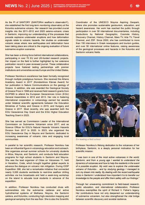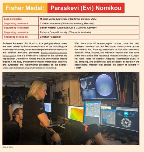 “Η IAVCEI με υπερηφάνεια ανακοινώνει ότι το μετάλλιο Fisher για το 2025 απονέμεται στην καθηγήτρια Dr. Paraskevi (Evi) Nomikou.