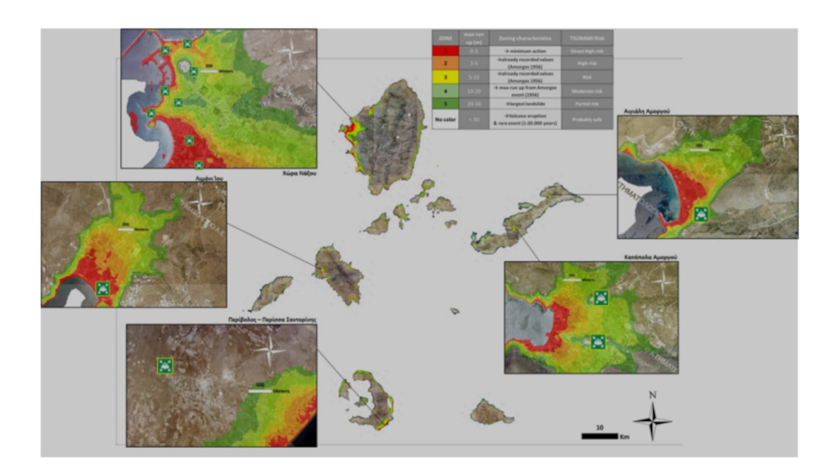 Συνημμένα παρατίθεται χάρτης με επιλεγμένες περιοχές των Κυκλάδων, στον οποίο αποτυπώνεται η συσχέτιση των ευάλωτων ζωνών σε επιπτώσεις τσουνάμι με τις θέσεις των σημείων συγκέντρωσης που έχουν υποδείξει οι τοπικοί Δήμοι. Οι περιοχές που σημειώνονται με κόκκινο χρώμα είναι οι πλέον ευάλωτες και δεν ενδείκνυται η τοποθέτηση σημείων συγκέντρωσης σε αυτές.