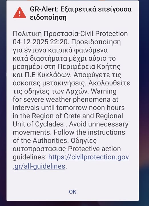 Χθες 4 Δεκεμβρίου στις 22:20 οι κάτοικοι της Σαντορίνης έλαβαν μήνυμα από το 112 για έντονα καιρικά φαινόμενα τα οποία θα εκδηλωνόταν κατά διαστήματα μέχρι σήμερα το μεσημέρι Παρασκευή 5 Δεκεμβρίου στη Περιφέρεια Κρήτης και Π.Ε. Κυκλάδων. Με την προτροπή να αποφεύγονται οι άσκοπες μετακινήσεις και να ακολουθούνται οι οδηγίες των Αρχών. Ο Δήμος Θήρας είχε εκδώσει ανακοίνωση με τα μέτρα Πολιτικής Προστασίας που πρέπει να τηρήσουν οι πολίτες καθώς και τα τηλέφωνα έκτακτης ανάγκης του Δήμου ενώ ανακοινώθηκε ότι δεν θα λειτουργήσουν οι σχολικές μονάδες για λόγους ασφαλείας.