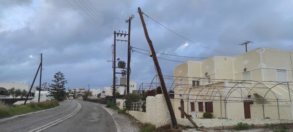 Κολώνα του ΟΤΕ έγειρε στο Μεγαλοχώρι από τους ισχυρούς ανέμους/@SantoriniMagazine-Χαρά Καπότου