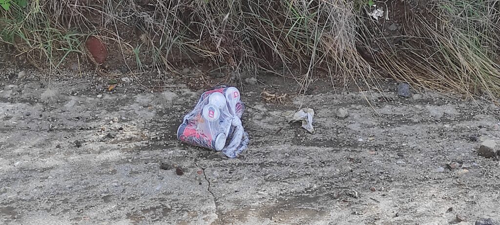 Στο Καμάρι δίπλα από ένα σπασμένο κλαδί δέντρου, βρήκαμε σακούλες σκουπιδιών που κάποιος βαρέθηκε να μεταφέρει στον κάδο όπως και τις τσιμεντένιες γλάστρες αντί για λουλούδια να είναι γεμάτες κουτάκια αλουμινίου αναψυκτικών αρκετά από τα οποία έχουν καταλήξει στην παραλία, πλαστικά μπουκάλια νερού δεν είδαμε πολλά και υποθέτουμε ότι θα ταξιδεύουν ήδη για Κρήτη ή Ανάφη.