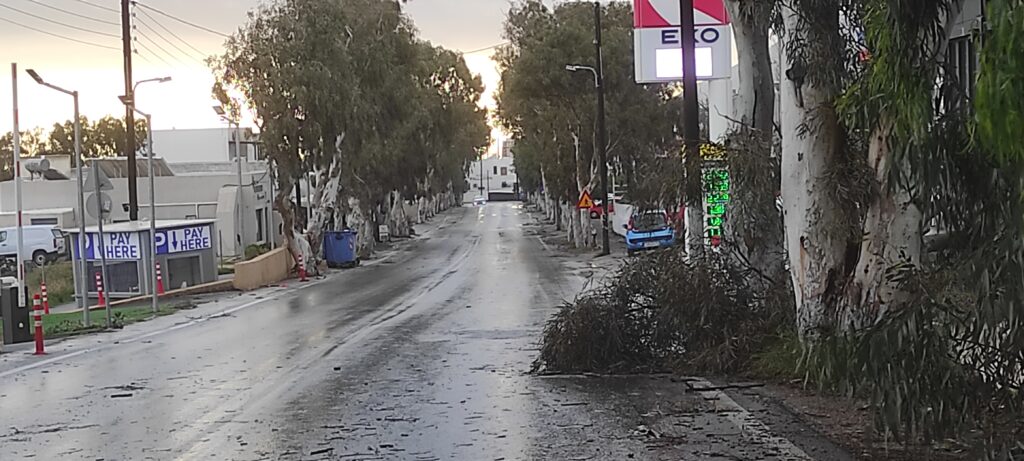 Σπασμένα κλαδιά βρέθηκαν στο οδόστρωμα στα Φηρά, στην Μεσαριά και σε άλλες περιοχές του νησιού χωρίς να έχει δημιουργηθεί κάποιο ιδιαίτερο πρόβλημα.