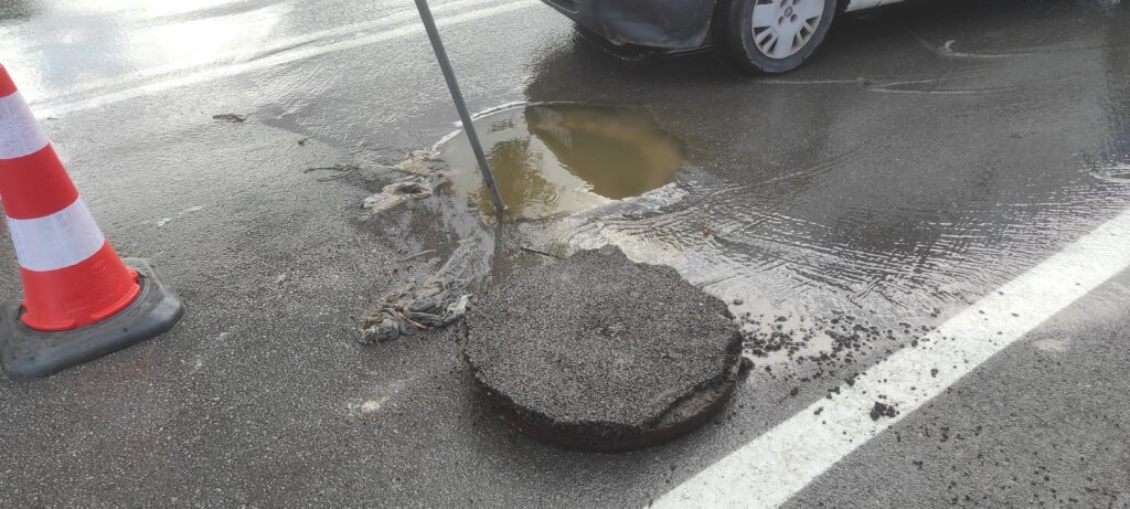Η ΔΕΥΑΘ χρειάστηκε να επέμβει σε φρεάτιο που υπερχείλισε στον δρόμο για το Καμάρι διότι είχε βουλώσει από μωρομάντηλα και άλλα αντίστοιχα υλικά που πετάμε με μεγάλη ευκολία στον δρόμο και στις αποχετεύσεις των σπιτιών και των καταστημάτων με αποτέλεσμα να χρειαστεί να παρέμβει με ειδικά μηχανήματα.