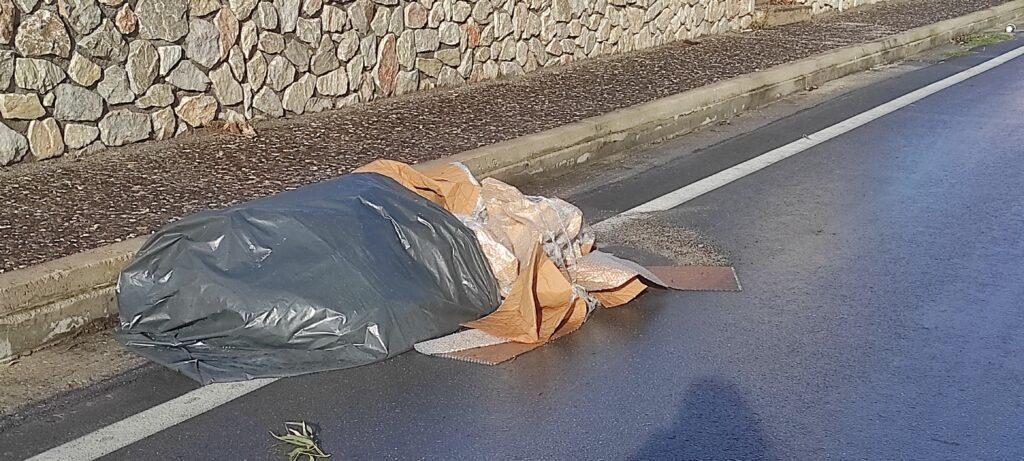 - Σακούλες και χαρτόνια πάνω στο οδόστρωμα/@SantoriniMagazine-Χαρά Καπότου