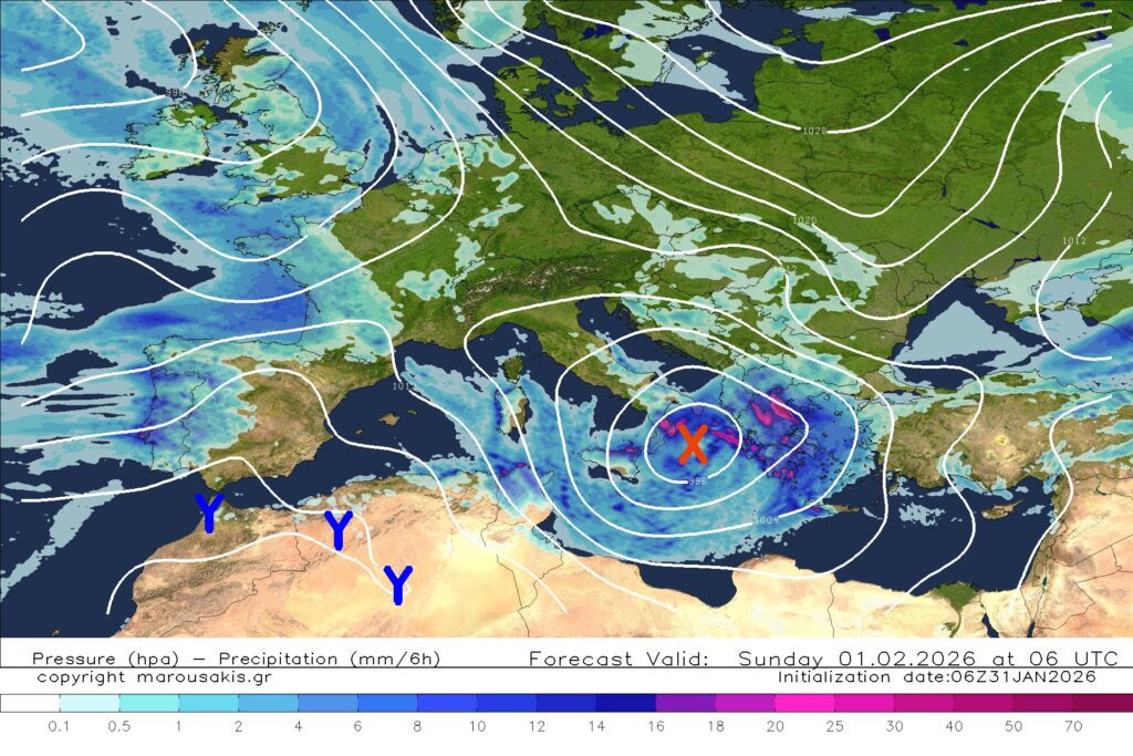 “Η απεικόνιση του βαρομετρικού χαμηλού από το προγνωστικό μας σύστημα καθώς και ο όγκος νερού που είναι δυνατό να πέσει στην επιφάνεια σε διάστημα 6 ωρών.