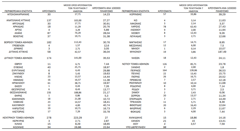 Ο συνολικός αριθμός των κρουσμάτων ανέρχεται σε 217.018 (ημερήσια μεταβολή +1.1%), εκ των οποίων 51.6% άνδρες. Με βάση τα επιβεβαιωμένα κρούσματα των τελευταίων 7 ημερών, 59 θεωρούνται σχετιζόμενα με ταξίδι από το εξωτερικό και 1.881 είναι σχετιζόμενα με ήδη γνωστό κρούσμα.