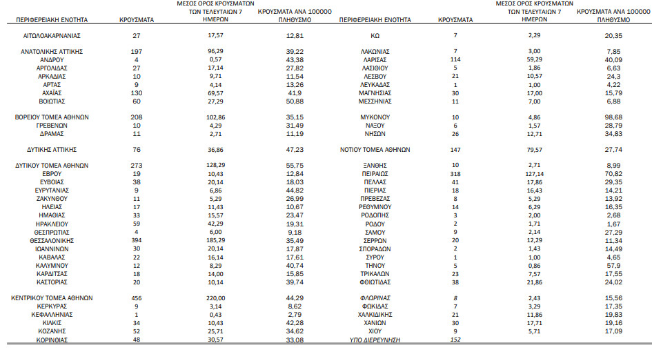Με βάση τα επιβεβαιωμένα κρούσματα των τελευταίων 7 ημερών, 75 θεωρούνται σχετιζόμενα με ταξίδι από το εξωτερικό και 1.966 είναι σχετιζόμενα με ήδη γνωστό κρούσμα.