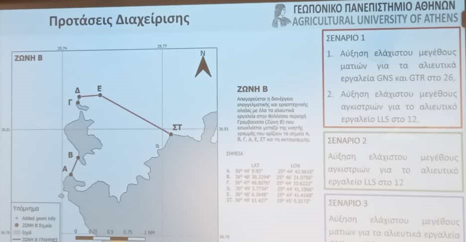 Όπως δήλωσε ο Δρ. Στέφανος Καλογήρου, επίκουρος καθηγητής του Γεωπονικού Πανεπιστημίου και επιστημονικός υπεύθυνος της έρευνας, που παρουσίασε τη μελέτη: «Περάσαμε από τη διαβούλευση με τους εμπλεκόμενους φορείς, υλοποιήσαμε και εφαρμόσαμε σε πραγματικές συνθήκες μαζί με τους αλιείς εκεί στα καΐκια τους, τεκμηριώσαμε πλέον επιστημονικά τις χωροχρονικές διακυμάνσεις που μπορούμε να προτείνουμε για να ελαττώσουμε τον αντίκτυπο της αλιείας στα θαλάσσια οικοσυστήματα και έχουμε καταθέσει προτάσεις ήδη από τον Δεκέμβριο του 2023 στη γενική διεύθυνση Αλιείας». Όπως συμπλήρωσε, «ζητάμε τη γνωμοδότηση του συμβουλίου Αλιείας από το ΥΠΑΑΤ και κατ’ επέκταση ένα νομοθέτημα που θα οδηγήσει στην οριοθέτηση των περιοχών αυτών που προτείνουμε».