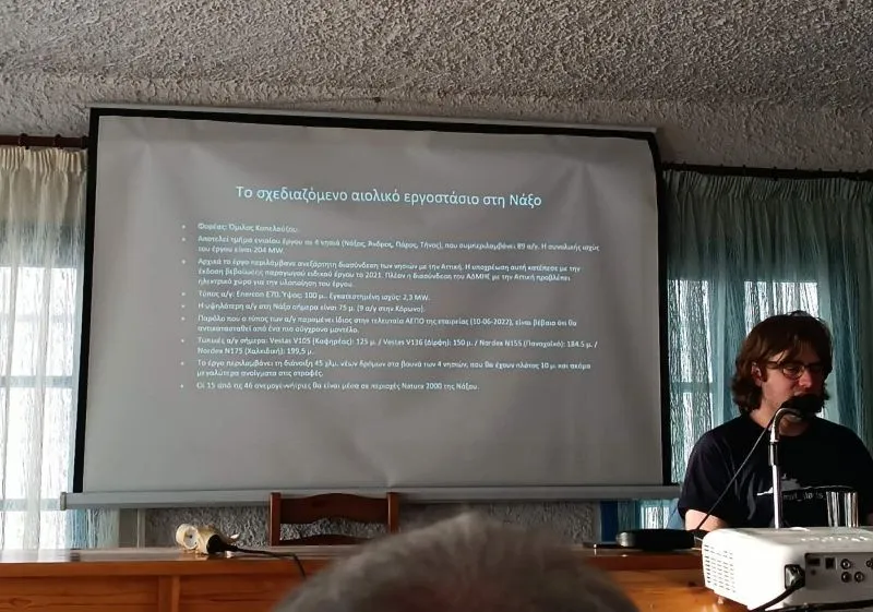 Η Κίνηση για την Προστασία των Νησίδων* διοργάνωσε στις 4 και 5 Μαΐου δύο ενημερωτικές εκδηλώσεις στη Νάξο-στο Χαλκί και στη Χώρα-με στόχο την πληροφόρηση των κατοίκων για την επικείμενη εγκατάσταση ενός χερσαίου βιομηχανικού αιολικού πάρκου με 46 ανεμογεννήτριες στη Νάξο, καθώς και ενός παράκτιου αιολικού πάρκου μόλις 2 χλμ. από τις ακτές της Δονούσας, όπου θα τοποθετηθούν 57 πλωτές ανεμογεννήτριες.