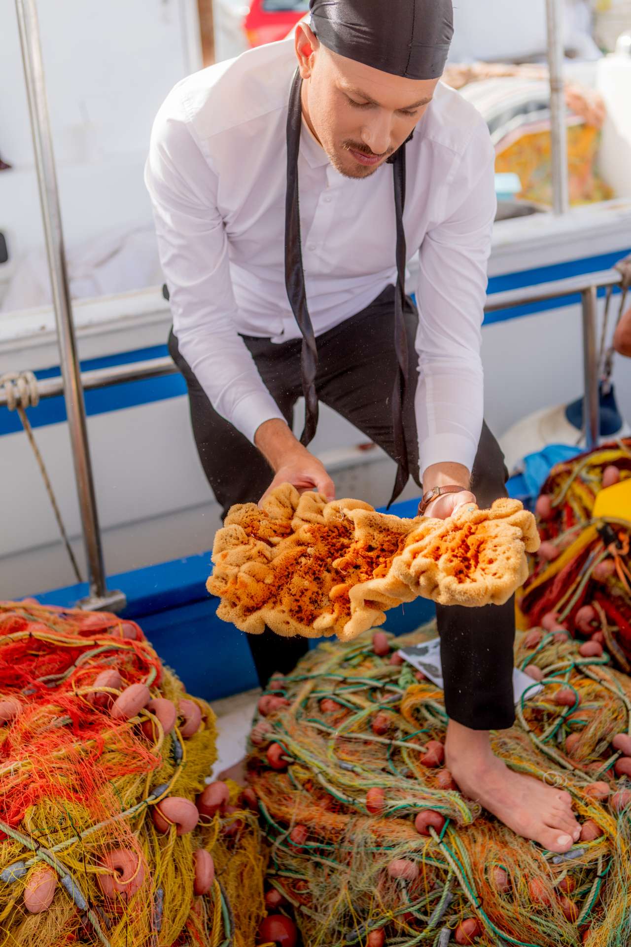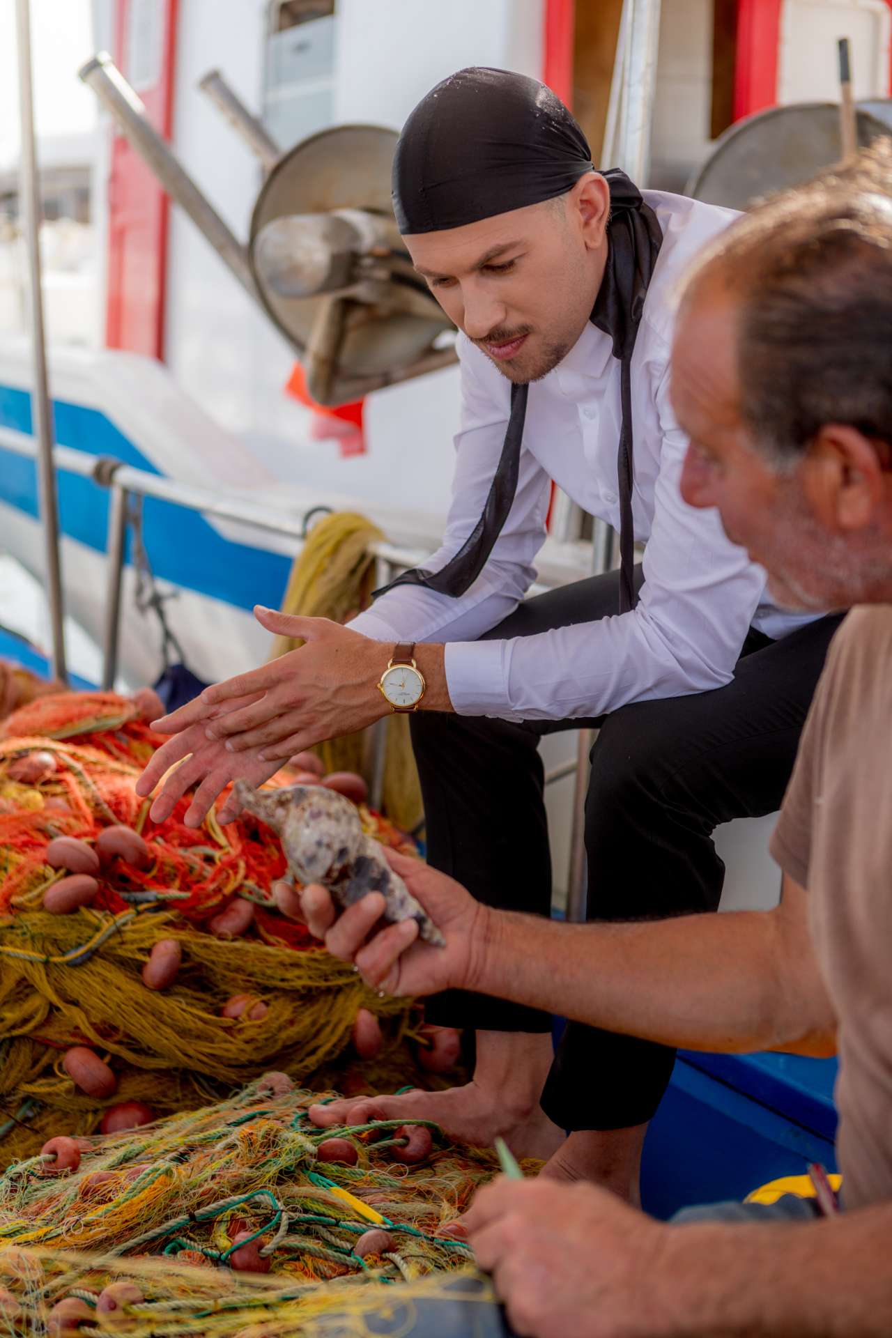 - Φωτογραφία του Παριανού συγγραφέα και εκδότη, Κωνσταντίνου Σταθερού, από το καΐκι του Βαγγέλη και του Δημήτρη (Τζίμη) στη Νάουσα. Ο συγγραφέας ακούει ιστορίες του χθεςαπό τον Τζίμη.