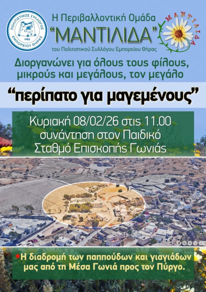 Έναν μαγικό περίπατο, την διαδρομή των παππούδων και των γιαγιάδων του νησιού από την Μέσα Γωνιά προς τον Πύργο, διοργανώνει για την Κυριακή 8 Φεβρουαρίου στις 11:00 η Περιβαλλοντική Ομάδα ” Μαντιλίδα”, του Πολιτιστικού Συλλόγου Εμπορείου Θήρας.