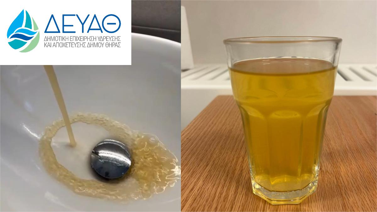 Τις τελευταίες ημέρες κάτοικοι της Σαντορίνης και συγκεκριμένα των περιοχών Έξω Γωνιάς και Μεγαλοχωρίου, ανάρτησαν στο διαδίκτυο φωτογραφίες και βίντεο από τις βρύσες των σπιτιών τους όπου το νερό που έτρεχε είχε κίτρινο- καφέ χρώμα.