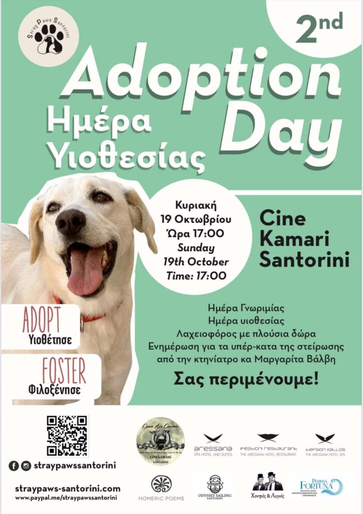 Για να μάθει ο κόσμος τι προσφέρει το καταφύγιο αλλά και τι συμβαίνει, να ευαισθητοποιηθεί αλλά και για να μπορέσουν τα αδεσποτάκια να βρουν ένα μόνιμο σπίτι να τα αγαπήσουν το Φιλοζωϊκό Σωματείο Stray Paws Santorini διοργανώνει την ερχόμενη Κυριακή 19 Οκτωβρίου στο Cine Kamari Santorini στις 17:00 την 2η Ημέρα Υιοθεσίας αδέσποτων ζώων. Καλώντας όλους τους κατοίκους και τους φίλους των αδέσποτων ζώων να πάνε να ενημερωθούν αλλά και που ξέρεις μπορεί να υιοθετήσουν ένα αδέσποτo. Πολλές από τις όμορφες φατσούλες θα βρίσκονται στο Cine Kamari Santorini για να γνωριστούν με τους υποψήφιους γονείς τους με την ελπίδα να αποκτήσουν το δικό τους μόνιμο σπίτι και να φύγουν από το καταφύγιο.