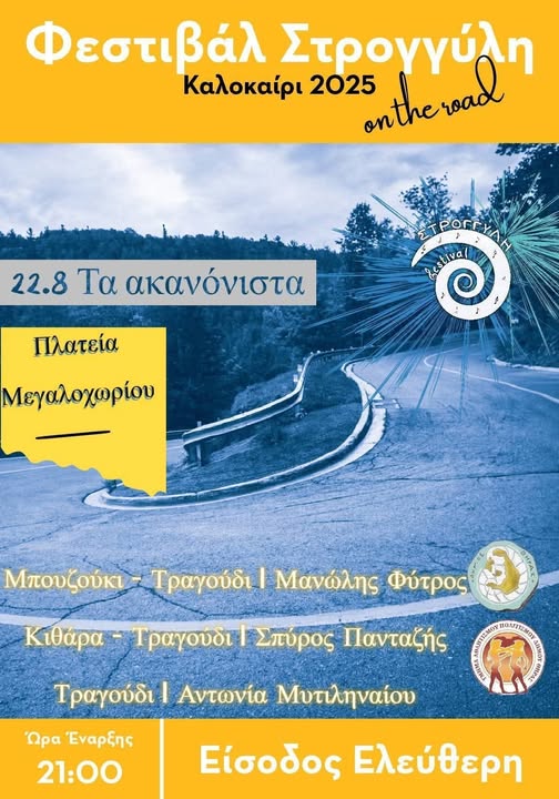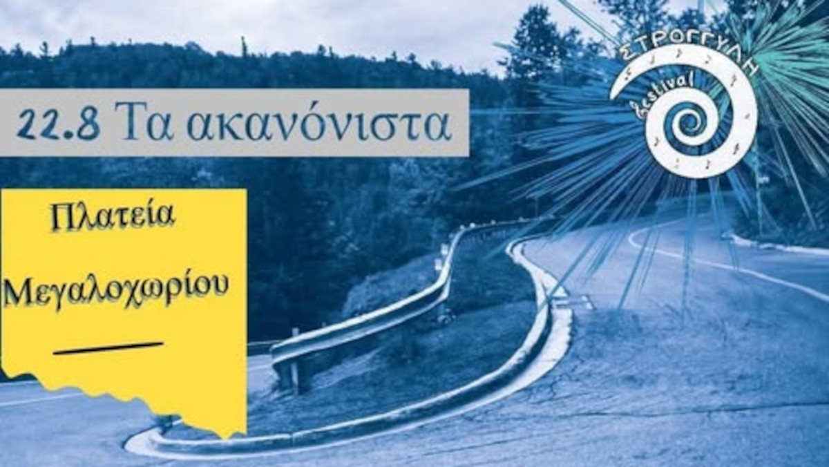 Μουσική βραδιά ” Τα ακανόνιστα”, με τον Μανώλη Φύτρο( Μπουζούκι- Τραγούδι), τον Σπύρο Πανταζή (Κιθάρα- Τραγούδι)και την Αντωνία Μυτηλιναίου( Τραγούδι) θα πραγματοποιηθεί απόψε 22 Αυγούστου στις 21:00 στην πλατεία στο Μεγαλοχώρι στο πλαίσιο του Φεστιβάλ Στρογγύλη.