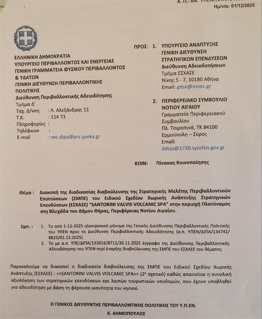 Να διακοπεί η διαδικασία διαβούλευσης της Στρατηγικής Μελέτης Περιβαλλοντικών Επιπτώσεων (ΣΜΠΕ) του Ειδικού Σχεδίου Χωρικής Ανάπτυξης Στρατηγικών Επενδύσεων (ΕΣΧΑΣΕ) “SANTORINI VALVIS VOLCANIC SPA” στην περιοχή Πλατύναμος στη Βλυχάδα του Δήμου Θήρας , Περιφέρειας Νοτίου Αιγαίου ανακοίνωσε με έγγραφό της στις υπηρεσίες των αρμόδιων υπουργείων, με ημερομηνία 1 Δεκεμβρίου 2025, η Γενική Διεύθυνση Περιβαλλοντικής Πολιτικής του Υπουργείου Περιβάλλοντος και Ενέργειας.