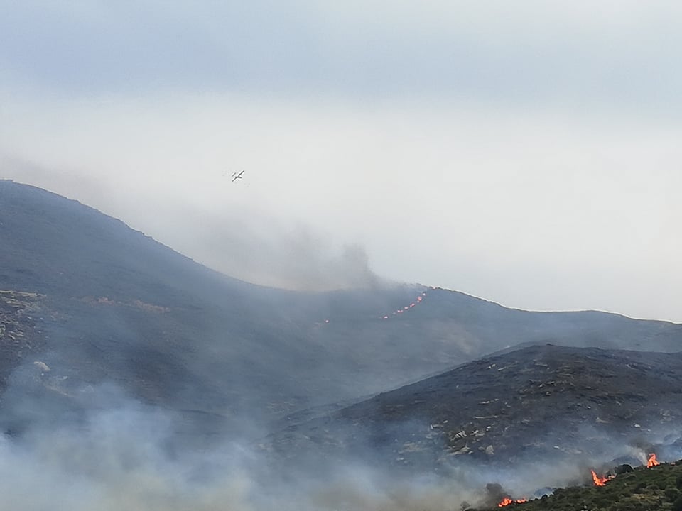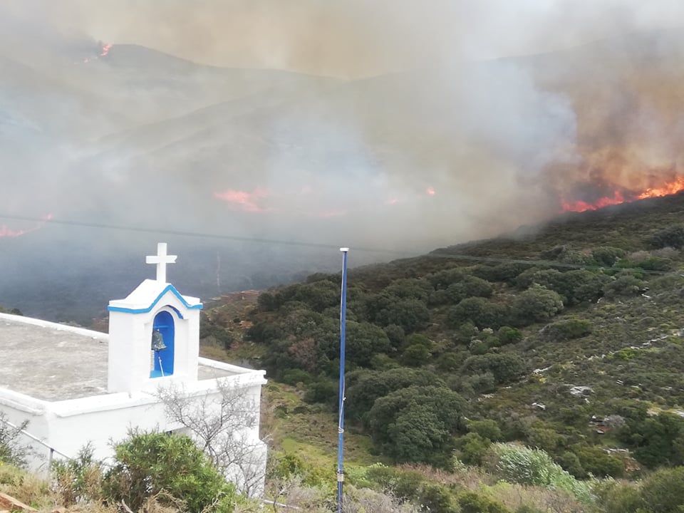 Σύμφωνα με την συνεργάτη του Santorini Magazine, δημοσιογράφο Ανδριάννα Μπόθου από το AndrosPortal.gr, η πυρκαγιά εντοπίζεται σε τρία μεγάλα μέτωπα την περιοχή Ρέματα, την περιοχή Ατένι και επάνω από την Κατάκοιλο .