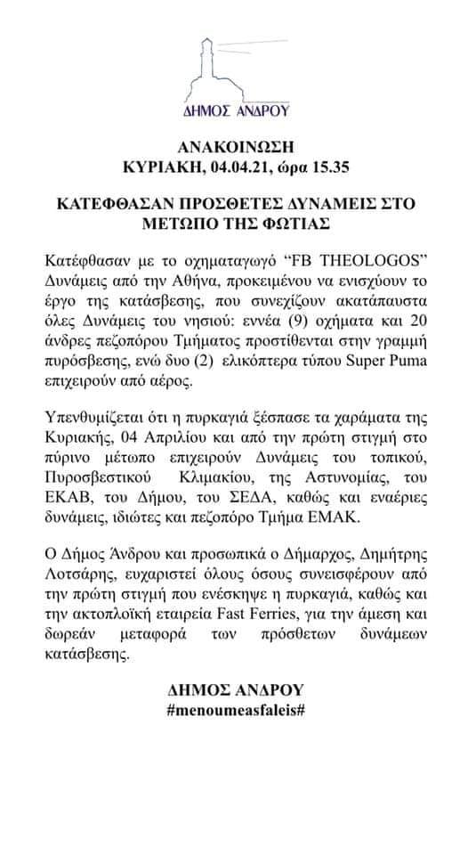 Στα μέτωπα της φωτιάς επιχειρεί το Πυροσβεστικό Κλιμάκιο Άνδρου ο Σύλλογος Εθελοντών Δασοπυροσβεστών Άνδρου, πυροσβεστικά μέσα του Δήμου Άνδρου και της Πολιτικής Προστασίας και εναέρια μέσα.